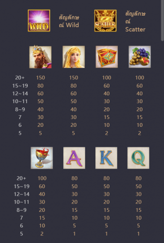 จะให้อัตราการจ่ายสูงที่สุดเมื่อคุณสามารถสร้างชุดคอมโบที่มีสัญลักษณ์ราชาไมดัสตรงตามเส้นการชำระเงิน (payline) ในอันดับที่ 1 จากทั้งหมด 8 สัญลักษณ์ที่มีในเกมนี้ โดยไม่รวมสัญลักษณ์ Scatter และ Wild