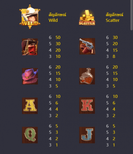 คาวบอย หากสะสมได้ 3, 4, 5, 6 อัน จะได้รับอัตราการจ่ายตามลำดับ 10, 20, 30, 50